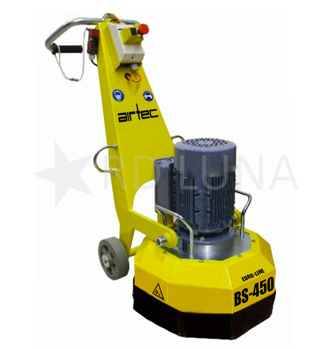 La pulidora de hormigón BS-450 de Airtec está diseñada para llevar a cabo desbastes de pavimentos en superficies horizontales de tamaño mediano y grande. Equipada con un sistema satélite de tres platos, la pulidora de hormigón BS-450 de Airtec destaca por su plato principal, que gira en una dirección, mientras que los otros tres platos más pequeños giran en la dirección opuesta. Este sistema ofrece una acción de trabajo menos agresiva sobre la superficie, a diferencia de las pulidoras con sistema monoplato, que están pensadas para desbastes más intensos.